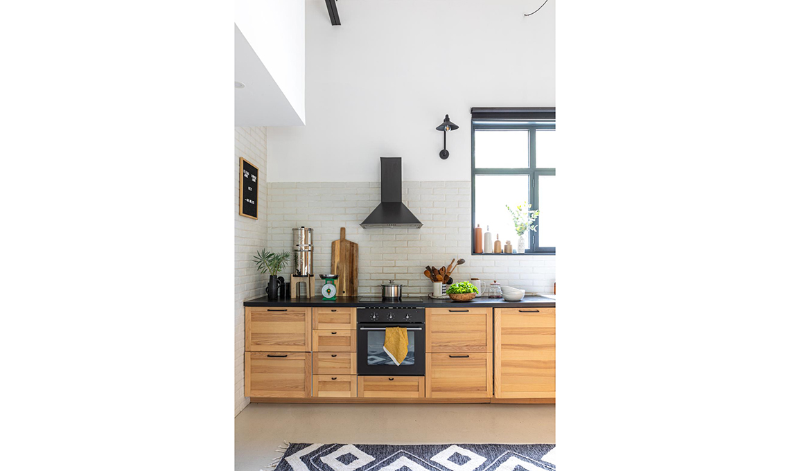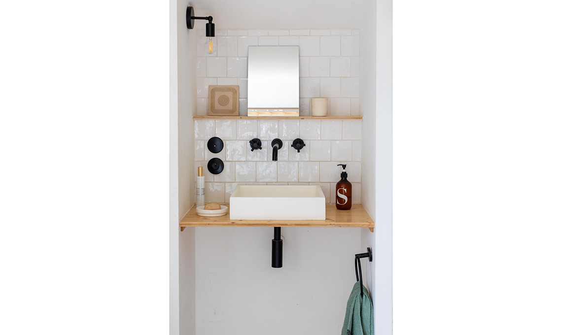 e angolo lavabo. Anche qui tornano echi dello stile industrial nella rubinetteria nera, oltre al tocco grezzo del legno con le mensole realizzate con avanzi di fogli di compensato di legno di abete trattati con un impregnante trasparente.