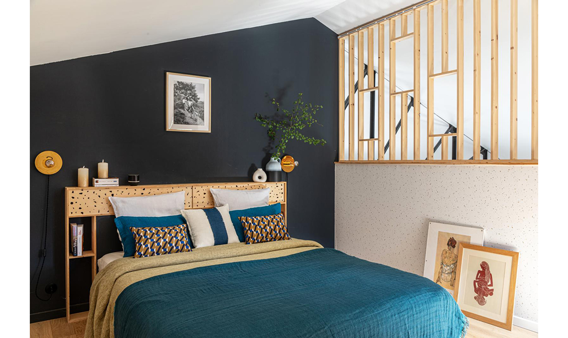 a effetto terrazzo. Il taglio antracite della parete con la testata dialoga con il séparé décor a grata che scherma la stanza padronale. La parete è dipinta con la pittura decorativa Railings N. 31 [Farrow & Ball]. applique dorate [Leroy Merlin].
