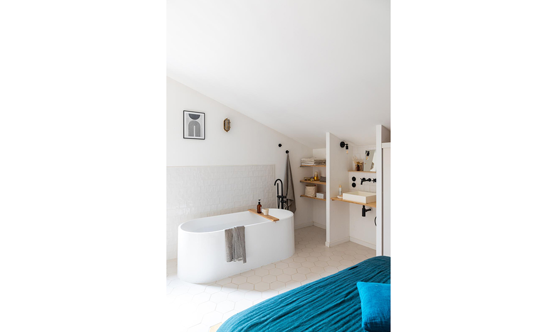 È a vista, aperta sulla stanza padronale, la piccola salle d’eau con vasca freestanding