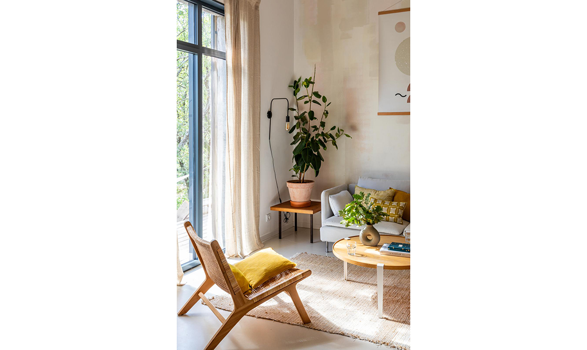 Divano Söderham e poltrona Bingsta [Ikea]. poltrona in rattan Ticao e tappeto [Maisons du Monde]. tavolino realizzato con piano [AmPm] e gambe [Tiptoe].