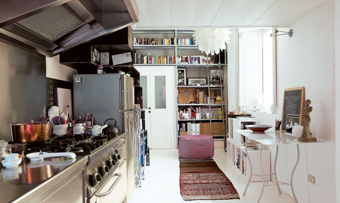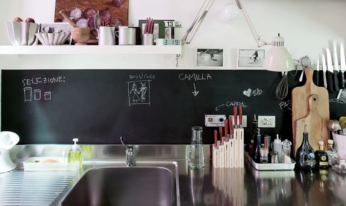 Con due padroni di casa così appassionati di cucina (e di cene fra amici) un’area di lavoro moderna, interamente in acciaio inox, sembrava davvero irrinunciabile. Camilla e Nicola hanno scelto un blocco di tipo industriale, “rubato” al mondo della ristorazione, ma tu puoi riprendere l’idea (eterna e sempre nuova) di abbinare al piano in metallo uno schienale effetto lavagna fai-da-te.