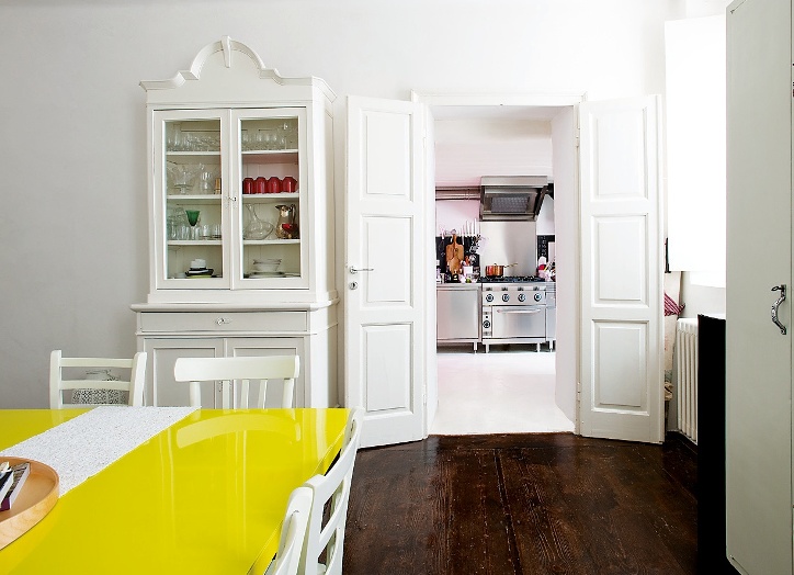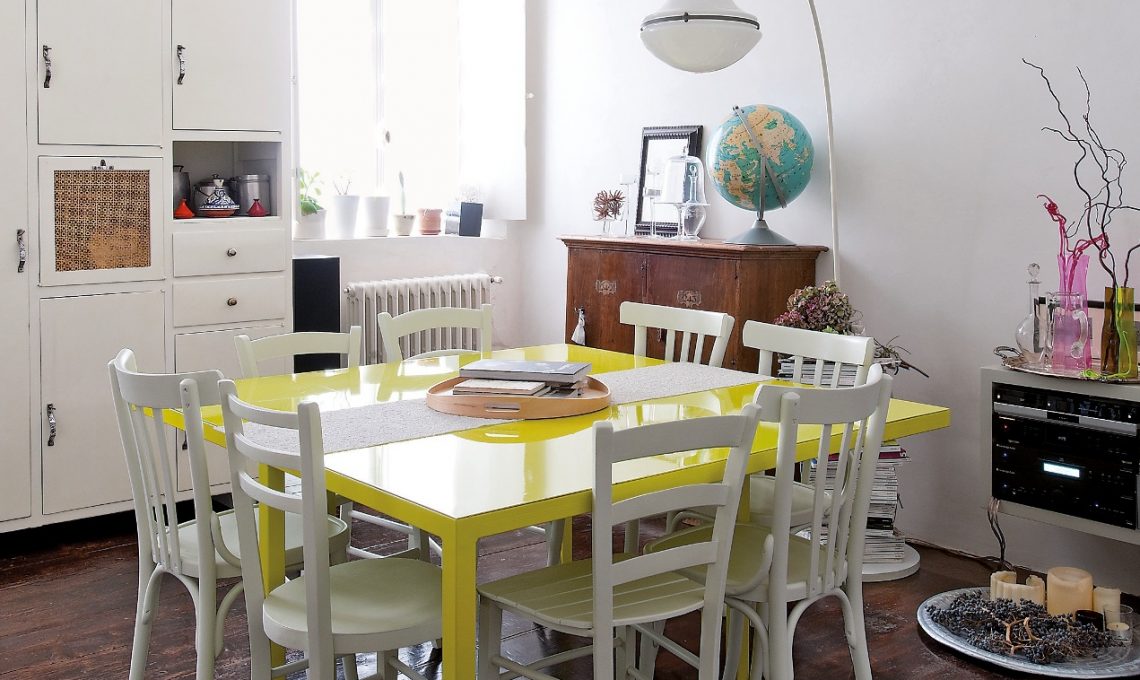 Sotto la lampada ad arco Anni Settanta (di recupero, come quasi tutte le altre luci) brilla un geniale contrasto: al pavimento originale si abbina un tavolo di metallo disegnato da Camilla, verniciato in un esplosivo giallo sole e... pronto a dividersi in due metà (da cm 70x140 cad), per accogliere fino a 12-14 ospiti! In configurazione quadrata (come nella foto), basta un semplice runner a celare ogni “stranezza” funzionale, mentre otto sedie rivisitate si allineano ordinatamente sui lati. Sul mobile più antico è “appollaiato” un mappamondo vintage tedesco.