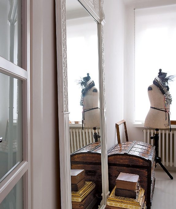 L’area più intima della casa avvolge di un candore assoluto eppure delicato, quasi caldo, che pervade ogni angolo e s’intreccia ai decori della vecchia porta trasformata in specchiera, alla trama del manichino divenuto portagioielli.