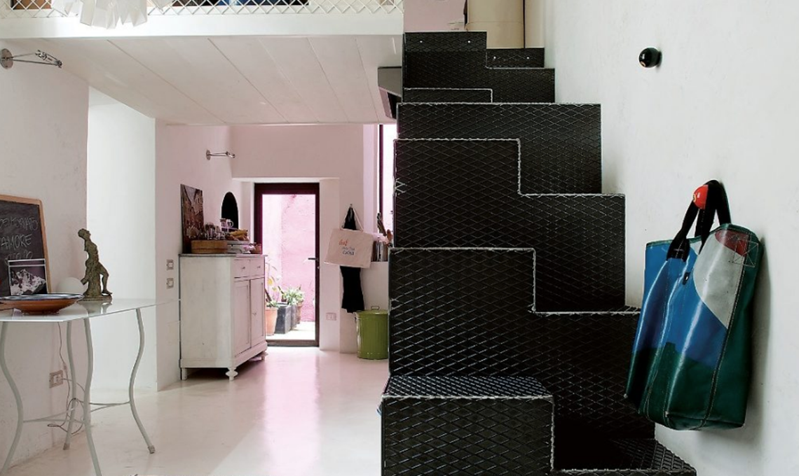 La scala in metallo nero, visibile appena entrati, sembra un intrigante ‘avvertimento’: qui le soluzioni troppo consuete non saranno ammesse...! Con gradini sdoppiati, nasce su progetto di Camilla. E nasconde la cucina alla vista!