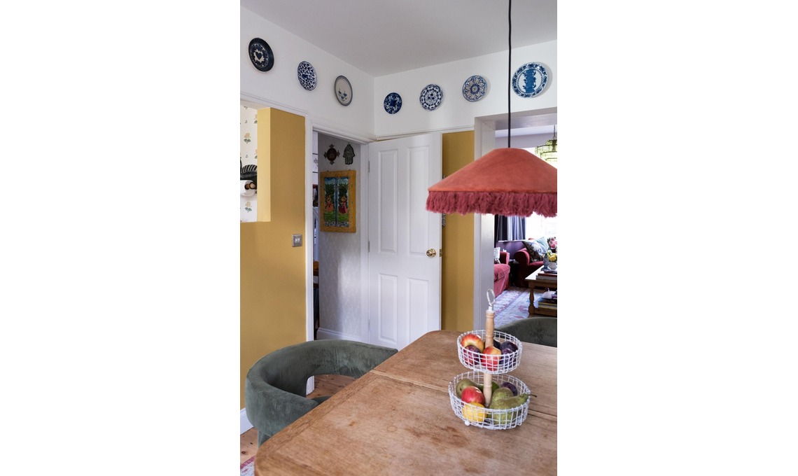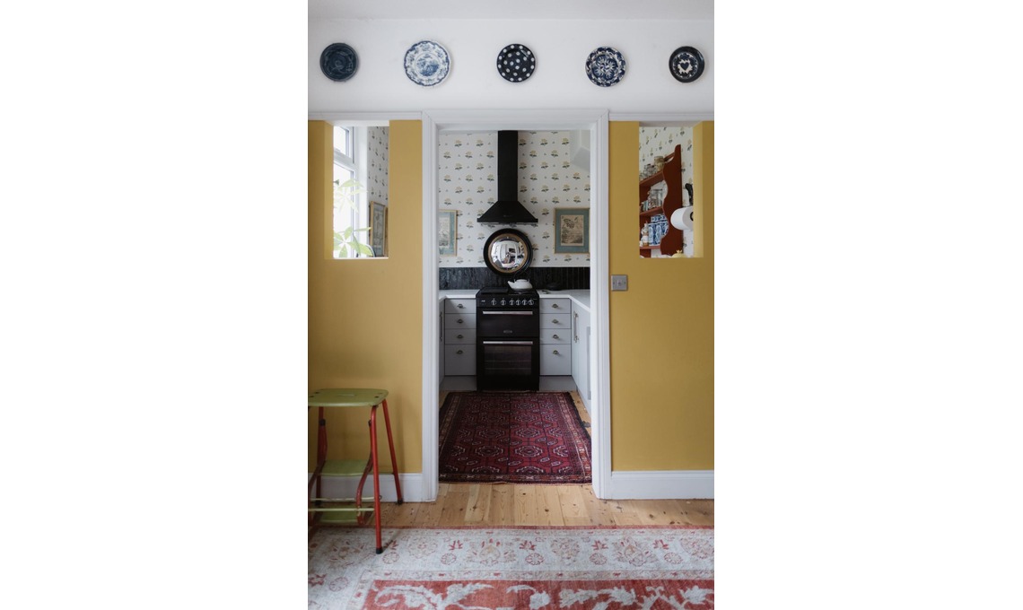 Lo stile country inglese torna nel giallo senape delle pareti decorate con una serie di piatti in blu appesi sopra la picture rail, e una carta da parati ‘granny style’ in cucina. Anche qui non mancano i tocchi etnici, con il bordo di piastrelline zellige che si innesta sulla wallpaper e il tappeto Ziegler, dai motivi ispirati agli antichi tappeti persiani. lampada a sospensione [Ian Snow]. Poltroncine in velluto