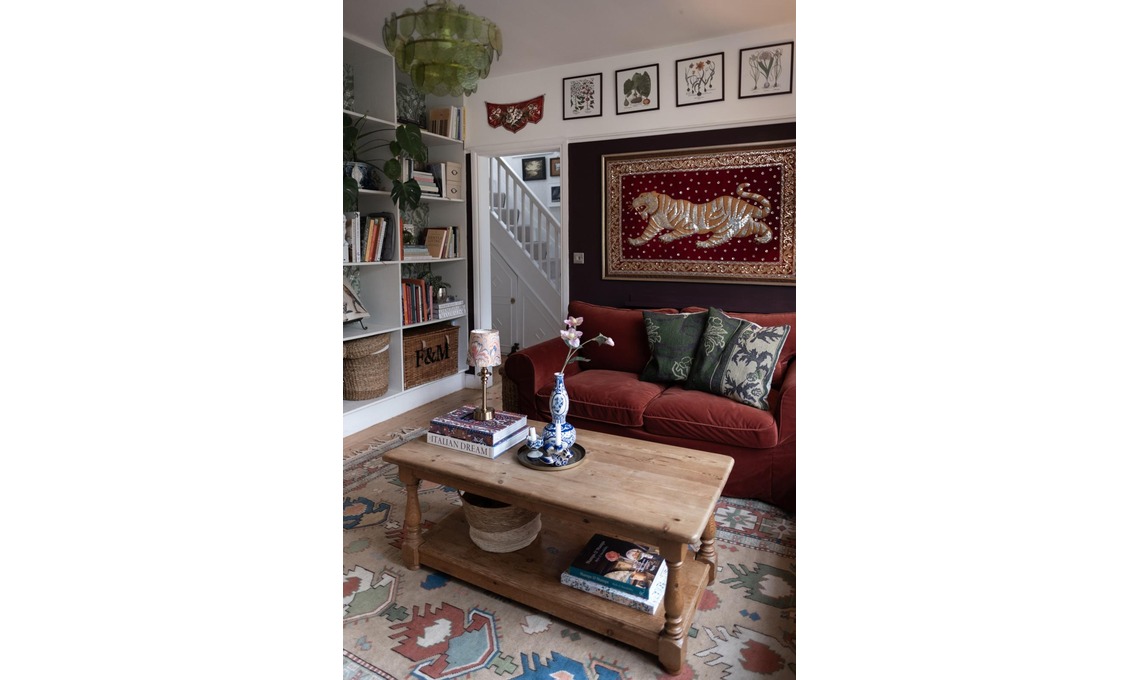 con un antico stendardo indiano raffigurante una tigre, fatto incorniciare. Una piccola idea da copiare anche per i cuscini sul divano, ricavati da vecchi tappeti orientali cuciti a mano. Divano Ektorp [Ikea] con rivestimento in velluto [Bemz], tavolino di legno acquistato su [Facebook Marketplace], lampada wireless [Pooky], lampadario chandelier in vetro [Dunelm].