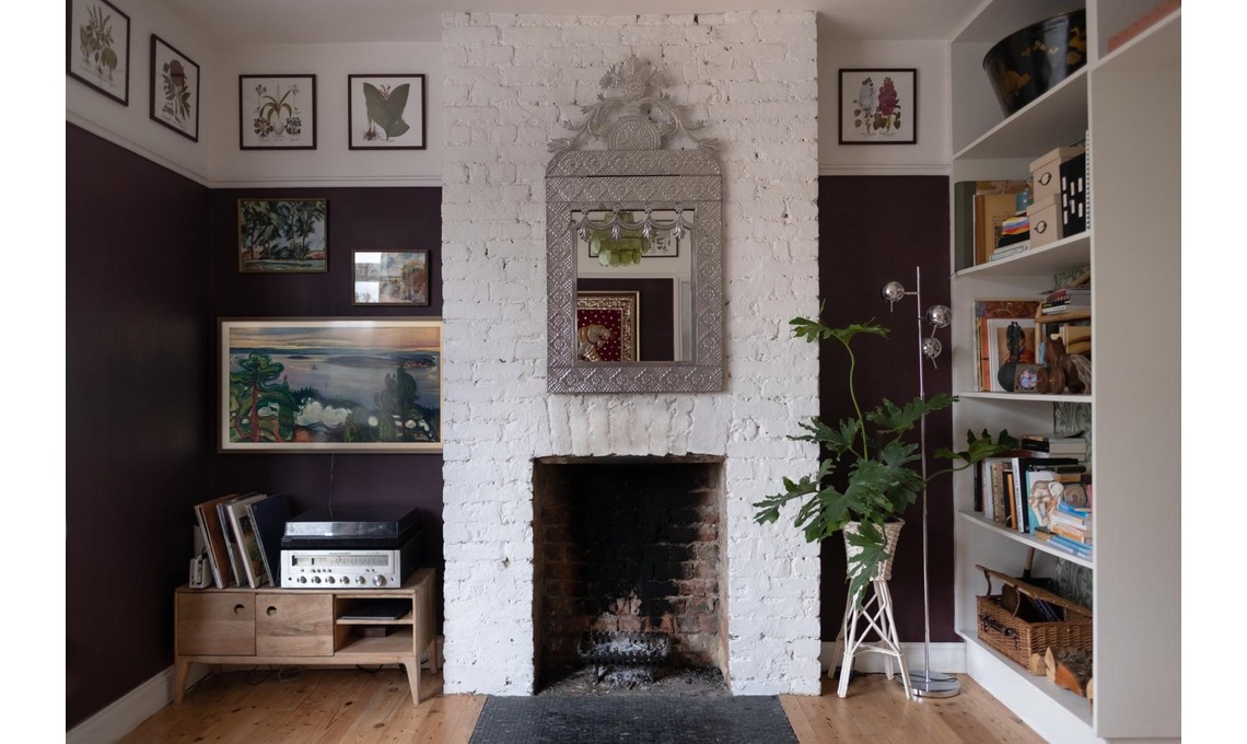 Sfoggia uno stile mix&match il living arredato da Anna, dove echi dello stile country – il pezzo clou è il camino smurato e lasciato aperto, come nelle case di campagna – convivono con il gusto etnico dello specchio messicano in latta e del tappeto Kilim. Décor la disposizione dei quadri botanici sopra la ‘picture rail’ (il profilo di legno a cui sono appesi i quadri più in basso) usato da Anna per delimitare la boiserie. Le pareti sono dipinte con la pittura decorativa Brinjal No. 222 [Farrow & Ball], specchio tradizionale messicano in latta [Gumtree], lampada da terra [» made.com], mobiletto in legno [Swoon].