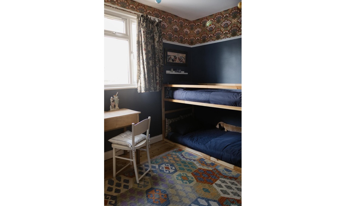 Funzionale, colorata e con tanto spazio per giocare. Sono queste le caratteristiche scelte da Anna quando ha arredato la stanza dei piccoli Teodoro e Leopoldo. Seguendo il metodo montessoriano, al classico lettino a castello di legno sono stati tolti i pannelli laterali di copertura per non lasciare barriere. Anche qui torna il binomio della parete dipinta (in azzurro polvere) con il bordo di carta da parati molto british. Vintage il tappeto Kilim che diventa tappeto gioco e la scrivania con le sedie. Letto in legno Kura [Ikea, cm 209x99x116h]. La parete è dipinta con la pittura decorativa Wine Dark No. 308 [Farrow & Ball]. Il bordo è realizzato con la wallpaper Bramble variante Rust [Rifle Paper Co., cm 69x8,20 m].