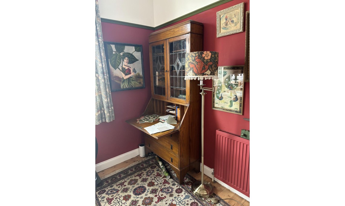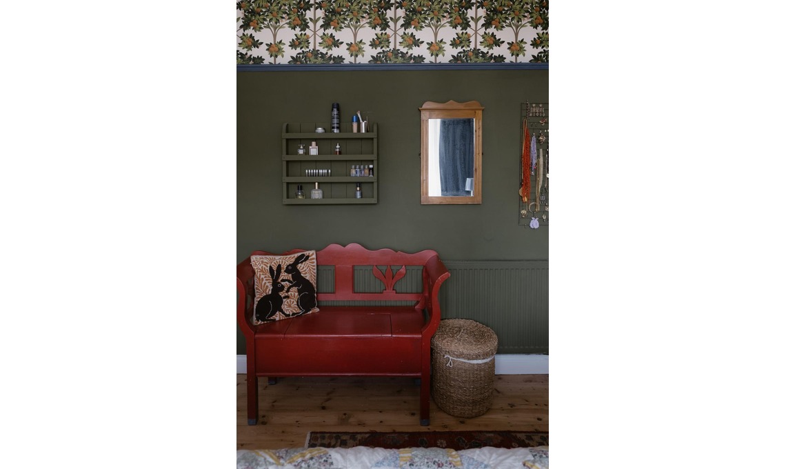 Anna ha dipinto la panca gemella del letto rosso cremisi, come lo studio. La panca, acquistata su [Facebook Marketplace] è dipinta con la pittura decorativa Incarnadine No. 248 [Farrow & Ball]. Da notare: la bacheca verde muschio che si mimetizza con la parete.