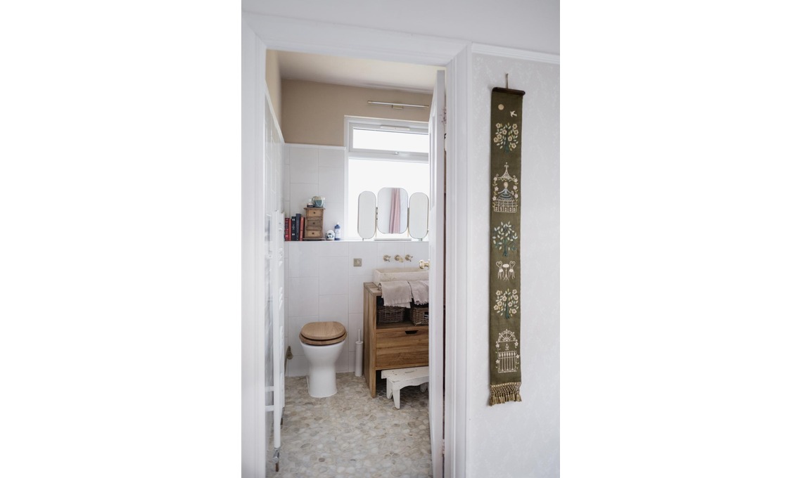 Toni neutri per la sala da bagno con il rilassante pavimento di mini ciottoli levigati. Qui la logica della casa è ribaltata: è il soffitto a essere colorato in un tenue rosa polveroso, mentre le pareti sono bianche, piastrellate. Il mobiletto di legno con cesti storage ospita