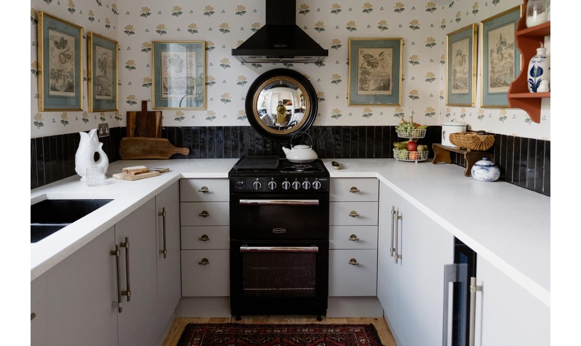 Bella idea! Lo specchio convesso è stato voluto da Anna per dare profondità e non dover guardare solo il muro quando cucina. Cucina economica [Rangemaster].