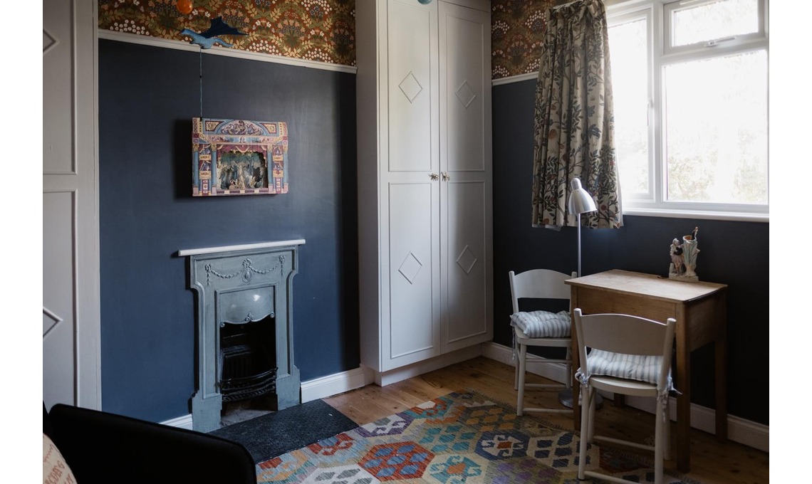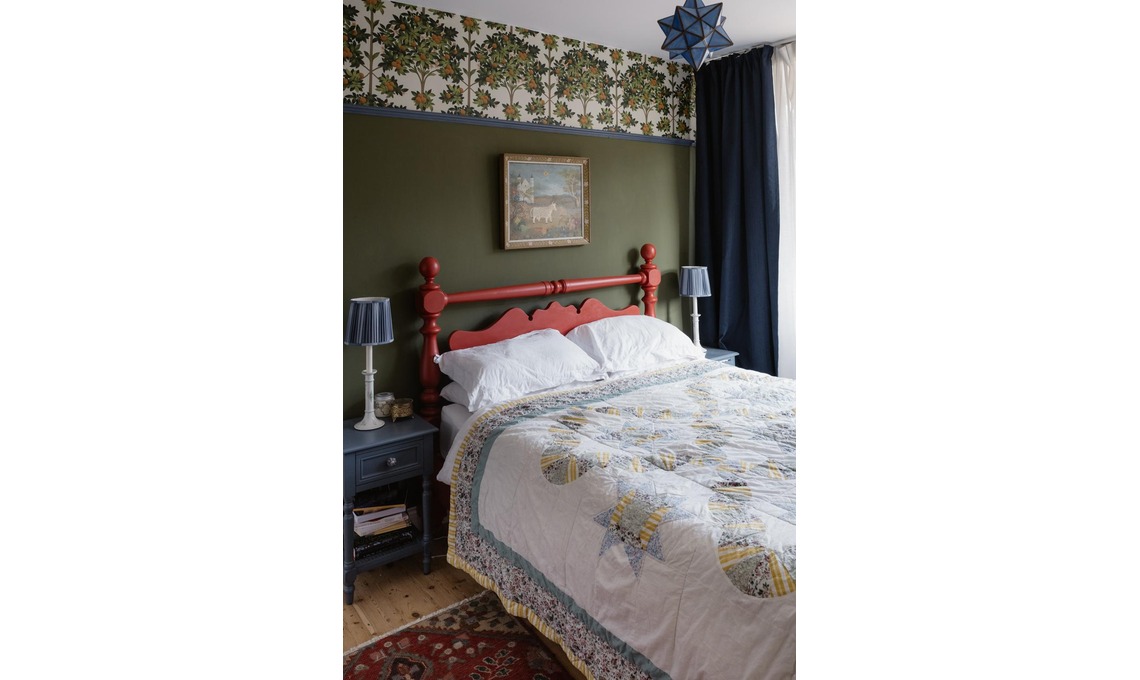 Nella stanza matrimoniale, copia l’idea del bordo di wallpaper tra il soffitto e il profilo dipinto in carta da zucchero, come i comodini: crea uno stacco super décor. Il letto acquistato su [Facebook Marketplace] è dipinto con la pittura decorativa Incarnadine No. 248 [Farrow & Ball]. Comodini [Dunelm] con pomelli dipinti a mano [Etsy]. Lampade vintage [eBay] con paralumi [Pooky]. wallpaper Orange Blossom’s [Cole & Son, cm 52x10 m il rollo]. La parete è dipinta con la pittura decorativa Bancha No. 298 [Farrow & Ball].