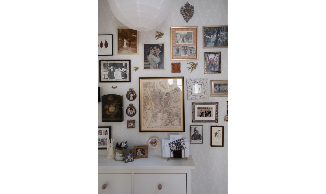 Decora l’ingresso della casa di Anna una wallart degli affetti, con un mix di memorabilia e foto delle famiglie lontane. Copia l'idea di appendere tanti quadretti di forme e grandezze diverse, che danno movimento e originalità alla parete. Scarpiera Hemnes [Ikea, cm 107x 22x101h] con pomelli in marmo rosa [H&M Home].