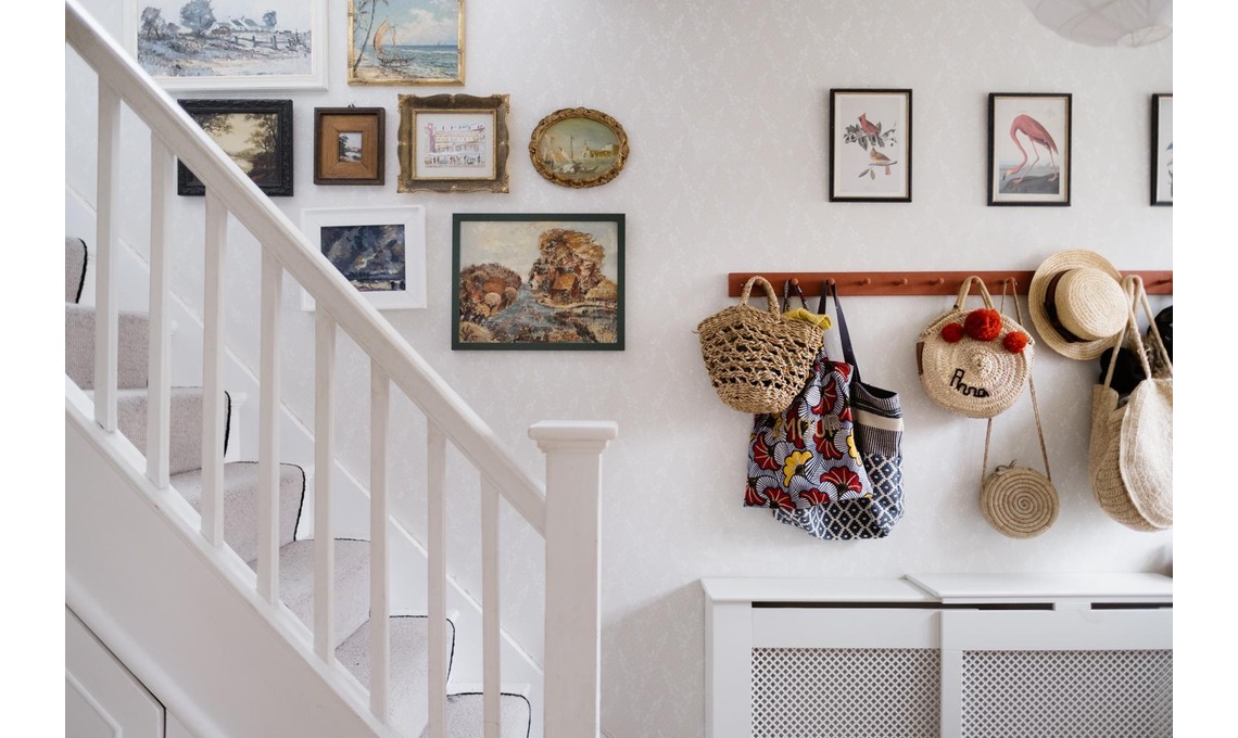 Lungo la scala che porta al piano superiore Anna ha appeso la collezione di dipinti a olio acquistati in mercatini e negozi di antiquariato. Una barra appendiabiti è utilissima anche per riporre cappelli e borse.