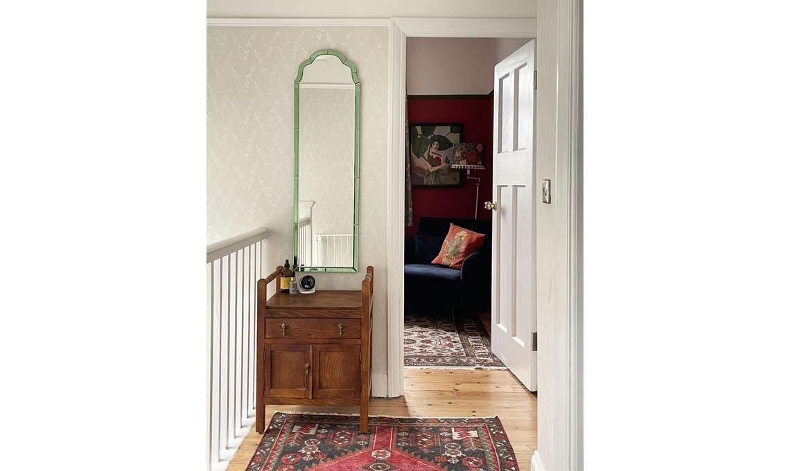 Nasce dall’opera di Matisse ‘Atelier Rouge’ l’idea di dipingere le pareti dello studio di casa nella coraggiosa tonalità di rosso cremisi. «Volevamo uno spazio che trasmettesse energia e vitalità, per affrontare con slancio i momenti di lavoro» racconta Anna, che condivide con il marito la stanza arredata con due bureaux gemelli antichi con ribalta, che servono da scrivania. Nel corridoio specchio [Oliver Bonas].