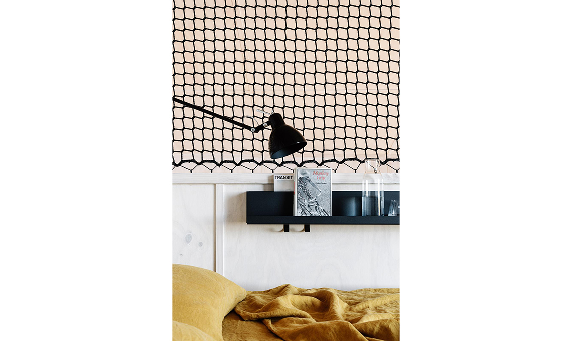 Il letto matrimoniale è posizionato in un angolo, con una mensola che sostituisce il comodino.
