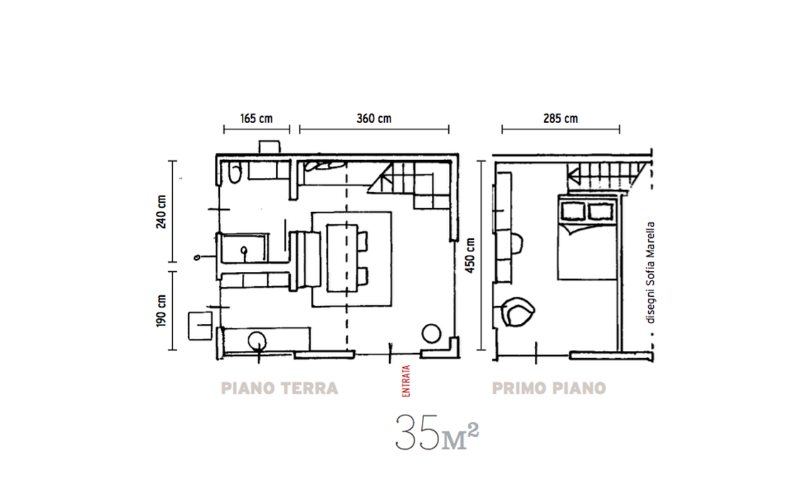 Zona pranzo, angolo relax, cucina e bagno. Lo spazio è minimo (35 mq in tutto!) ma ben sfruttato, grazie ad arredi su misura che si trasformano: la mini cucina; la seduta davanti al tavolo che si apre e diventa letto; un daybed che, sotto, offre spazio contenitivo.