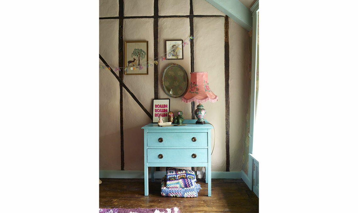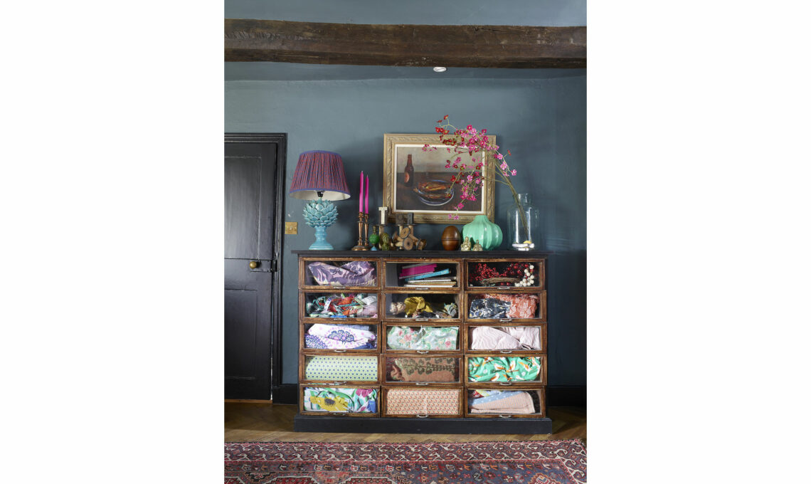 L’oggetto chiave in questa stanza è il mobile da drogheria (immerso nella tonalità Inchyra blue di Farrow and Ball), che mette sottovetro le biancherie naïf.