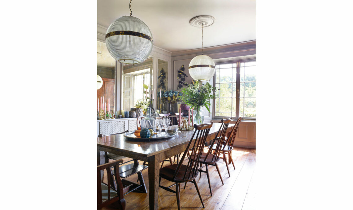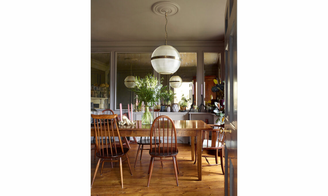 Sedie vintage [Ercol], tavolo [Peppermill Interior]. Sopra il tavolo, bottiglia [Pols Potten].