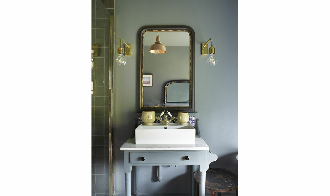 Le pareti del bagno dipinte di grigio, creano una base neutra perfetta per arredi eclettici e tessuti colorati.