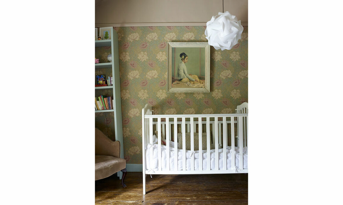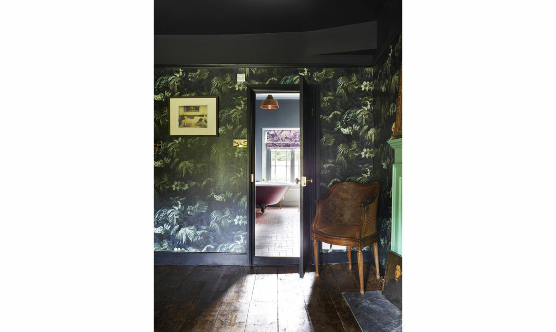 La carta da parati a tema floreale Limerence [House of Hackney] e il soffitto dipinto di nero/blu danno la sensazione di guardare il cielo notturno e di trovarsi immersi in un altro... altrove!