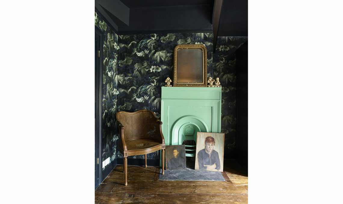 Tira fuori il colore più brillante dalla carta da parati a sfondo scuro e usalo su unsolo elemento: non è bellissimo questo camino rivitalizzato conil tono Arsenic [Farrow and Ball]?
