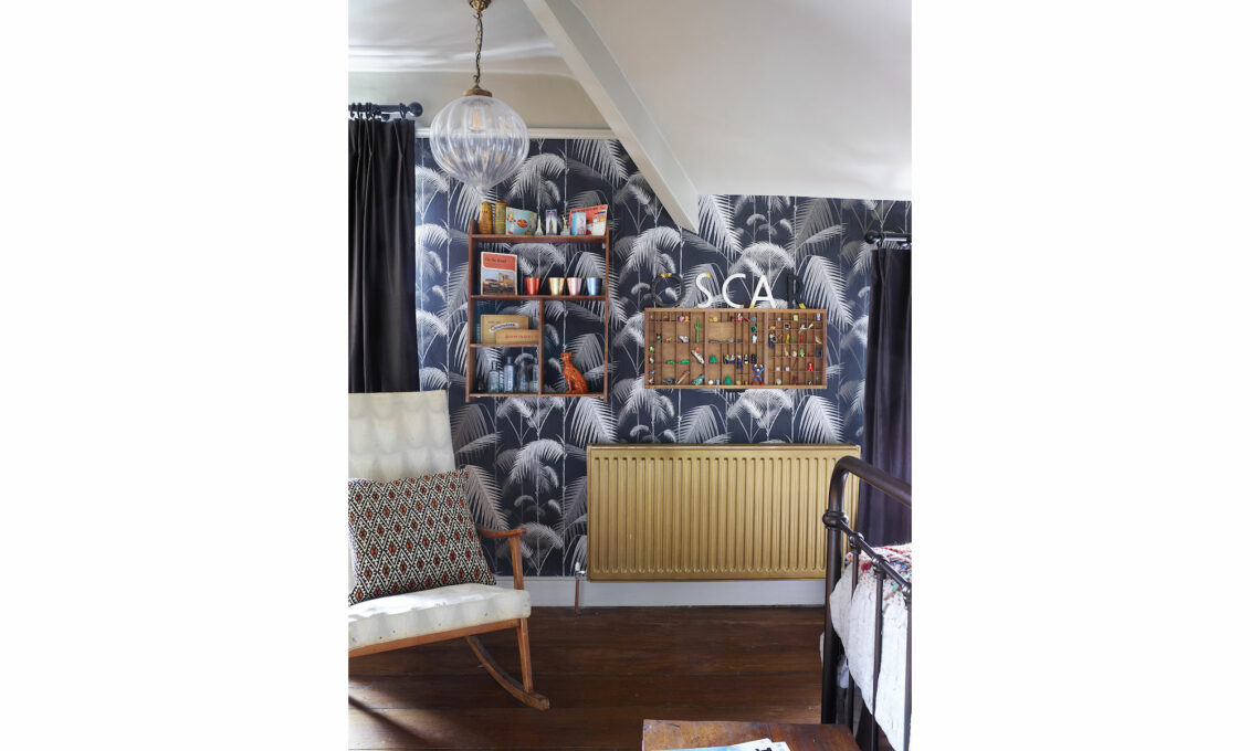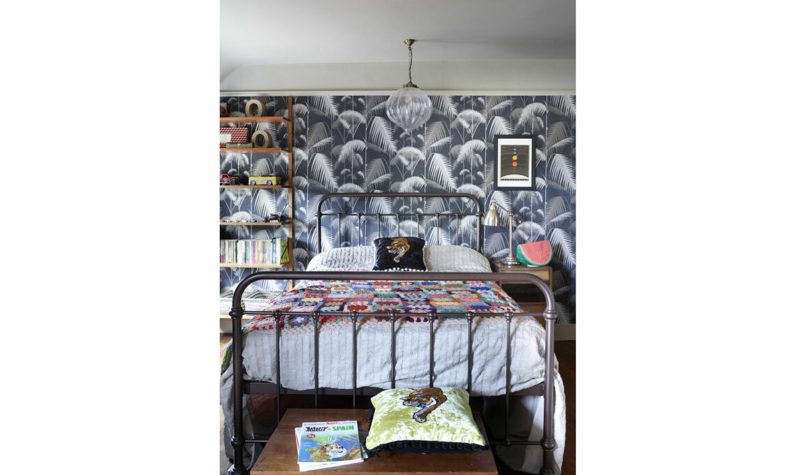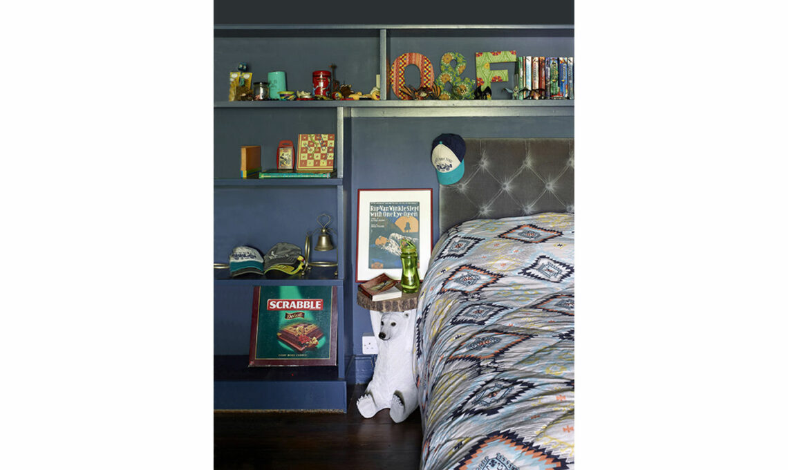 La camera di Flynn è ritratta in alto e trova posto in quello che era uno studio dotato di librerie: Susy ne ha rimosso una parte per inserire la testiera. Poi ha ridipinto pareti e scaffali con Stiffkey Blue di [Farrow and Ball]: per il legno, in finitura eggshell.