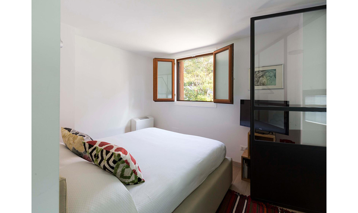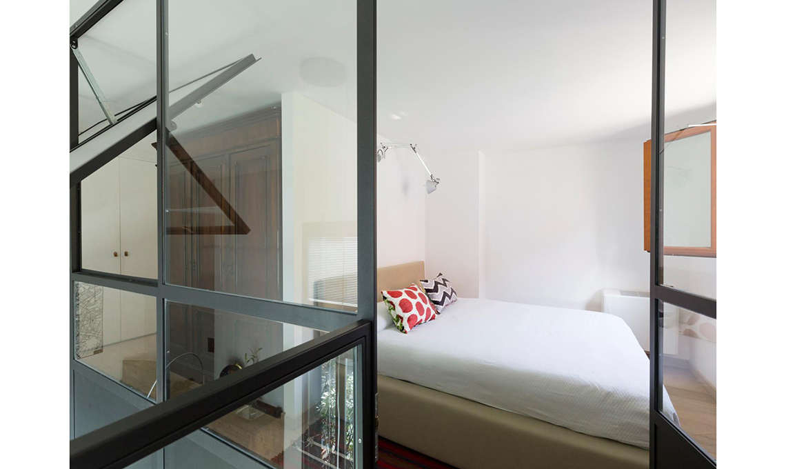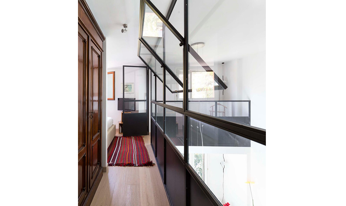 La chiusura ideata per la porzione soppalcata merita un approfondimento: alcune vetrate sono dotate di un’apertura basculante che permette di aprirle o chiuderle secondo le esigenze. Vetrata con finestre basculanti: disegno e realizzazione di [Alise Sicuri] & team. lampada a braccio Tolomeo [Artemide].