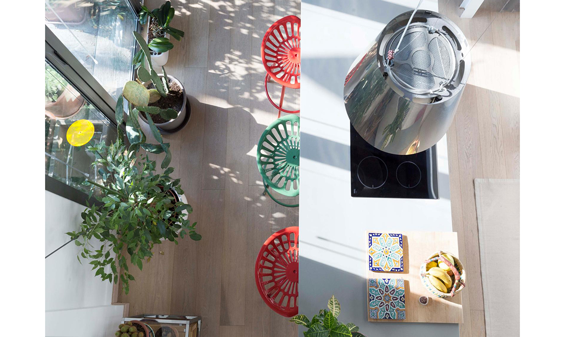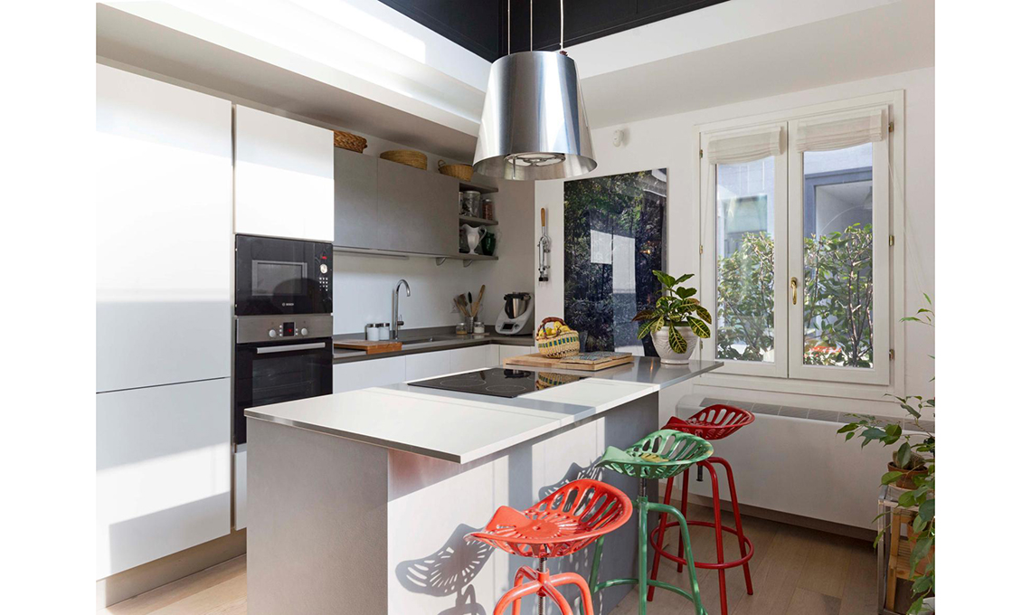 Il soffitto alto ben 5 metri è stato valorizzato con una cappa aspirante sospesa. Per ciò che riguarda l’illuminazione, invece, in casi come questi ti consigliamo di affidare il compito a un tecnico specializzato.
