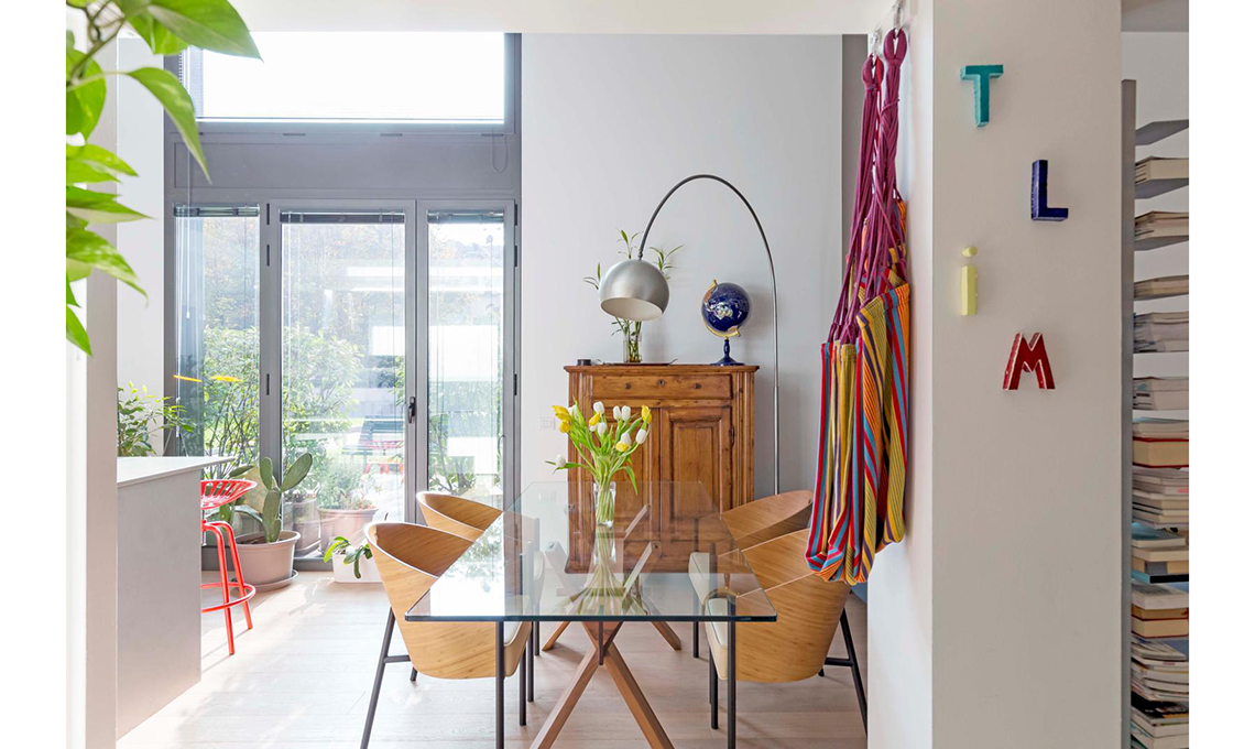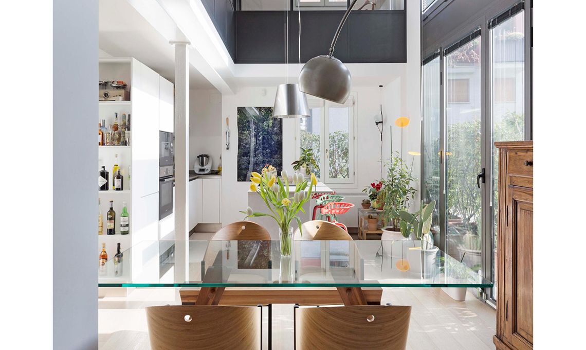 città e il verde dei terrazzi. Ad amplificare questo effetto ci pensa anche il cristallo del tavolo da pranzo. Così l’occhio viaggia senza intralci per tutto l’ambiente! Tavolo in legno massello Cavalletto [Diotti], sedie Costes