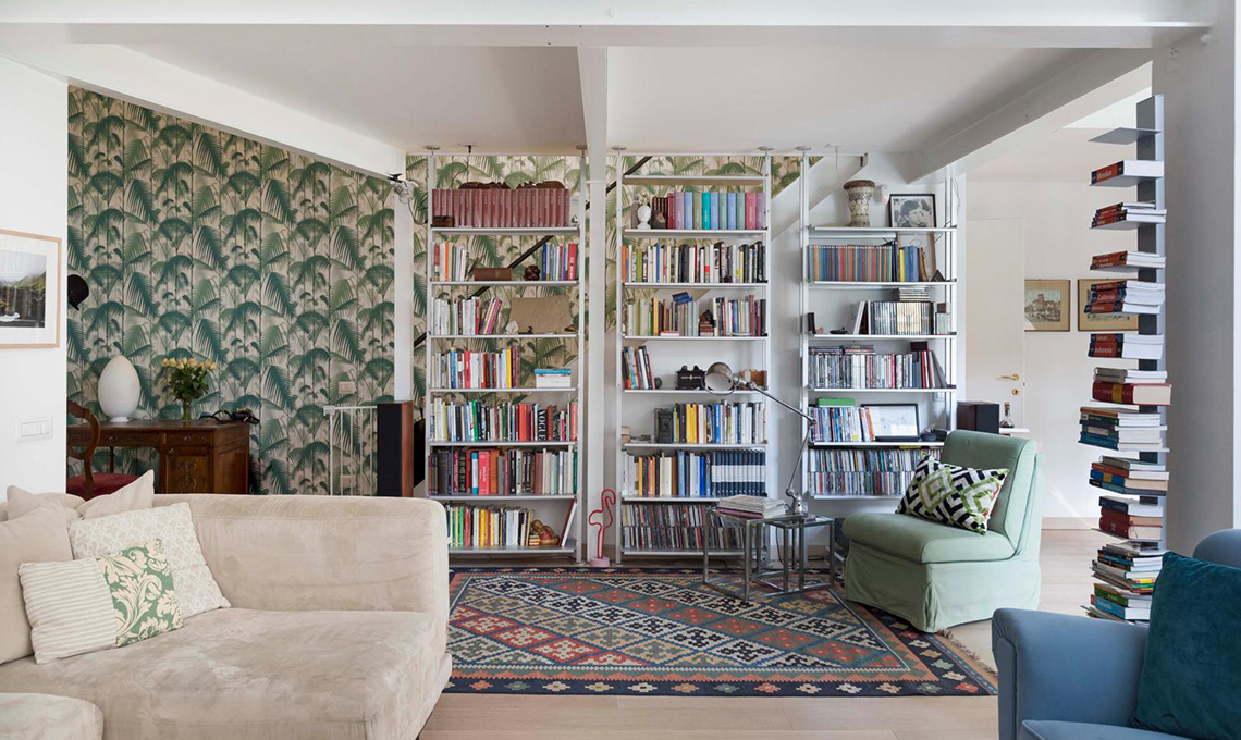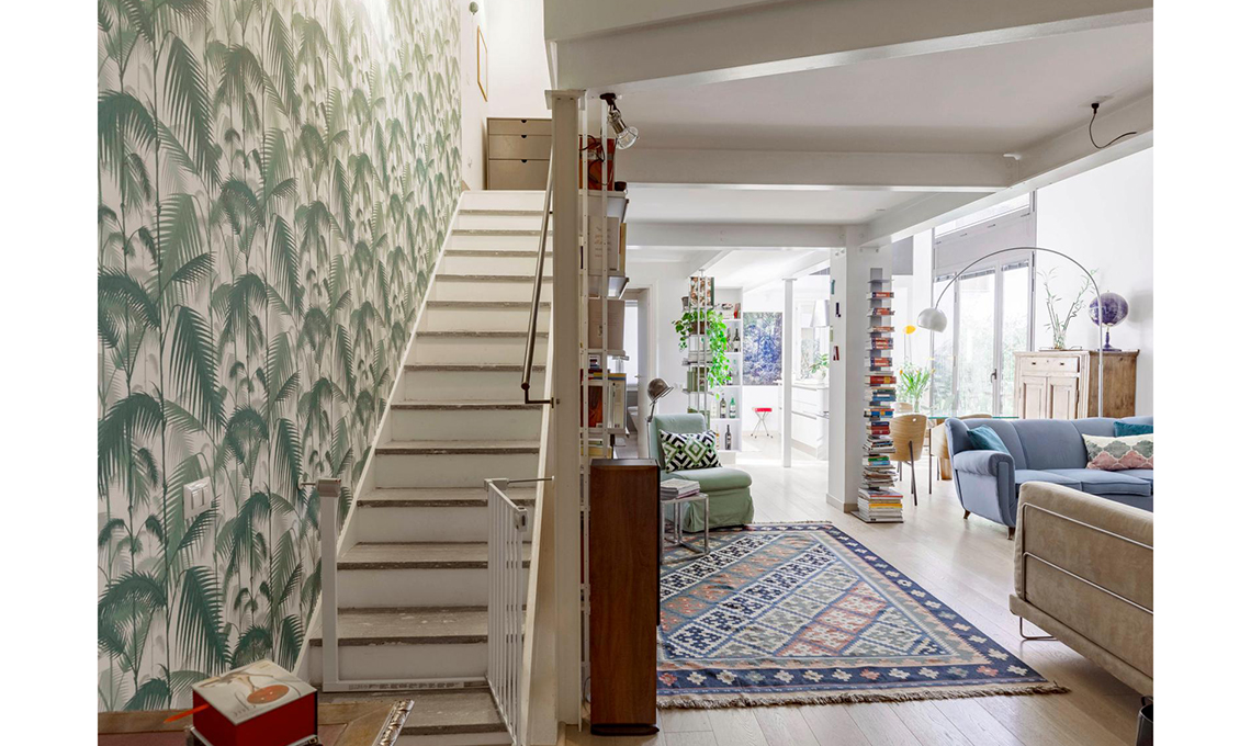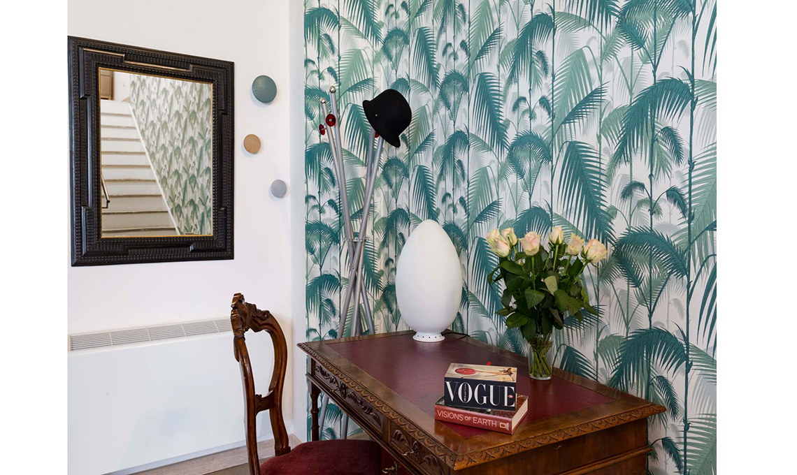 La storica wallpaper Palm Jungle è stata posata per valorizzare la parete della scala e, con il gioco dei pieni e dei vuoti creati dalle stesse librerie in metallo, fa capolino tra libri e oggetti: guarda alle pagg. 84-85. Uno sfondo evergreen che dà dinamismo anche al più classici degli scrittoi.