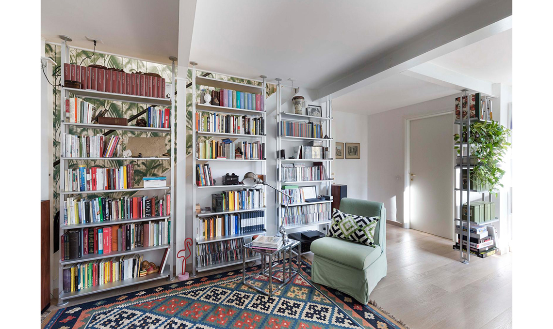 Nei loft gli elementi strutturali sono protagonisti. Così si è attrezzata la zona davanti alla scala con librerie in metallo, a fissaggio tetto/terra. Divano bianco Tylosand [Ikea], libreria K2 [Kriptonite], lampada a bracci vintage Standard [Jieldé]. La libreria ’totem’ sulla destra si ispira alla Ptolomeo [Opinion Ciatti]. Sulla scrivania, lampada Uovo Media [FontanaArte].