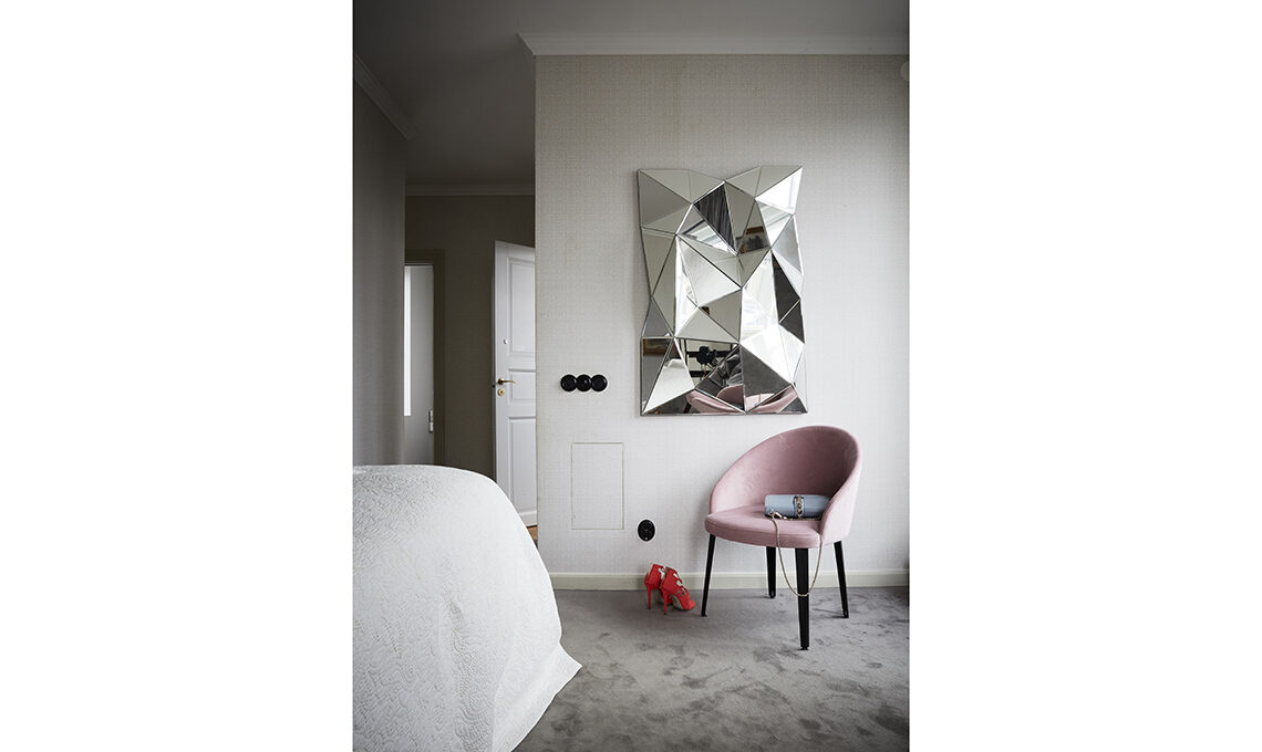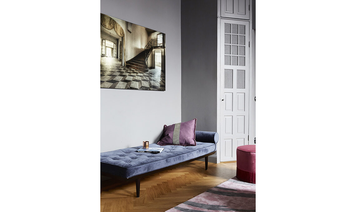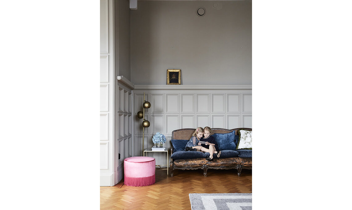 Adèle, sei anni, e Märtha, quattro, stanno insieme su un divano vintage che si è trasferito con Malin nelle sue ultime tre case. Dei nuovi cuscini di velluto blu pavone hanno aggiunto il fattore comfort! «Il sesto senso per lo stile l’ho ereditato da mia madre, che aveva un talento nel mescolare l’antiquariato gustaviano con il design contemporaneo.