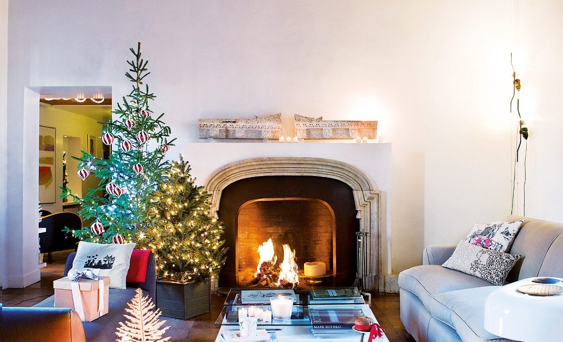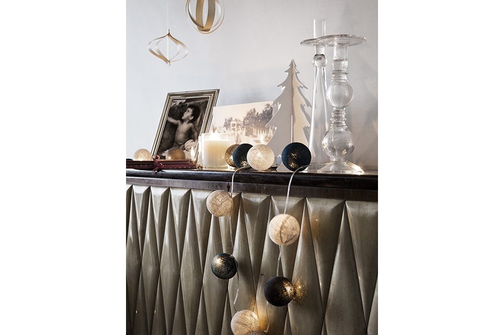 La luce è l’elemento scelto per decorare la zona giorno in modo romantico. Candele, lucine e decorazioni (EDG Enzo De Gasperi), tutte sulle nuances neutre del bianco caldo, sembrano riflessi del fuoco del caminetto. Sul mobile vintage (disegno di Gio Ponti), palline luminose black&white richiamano lo stile anni ‘40, accanto all’alberello di Natale Avana Grande (Essent’ial, €21) e ai portacandele classici in vetro soffiato. A sospensione, le Plywood Ball di Ferm Living (da €2,75 su http://www.trendhouse.it).
