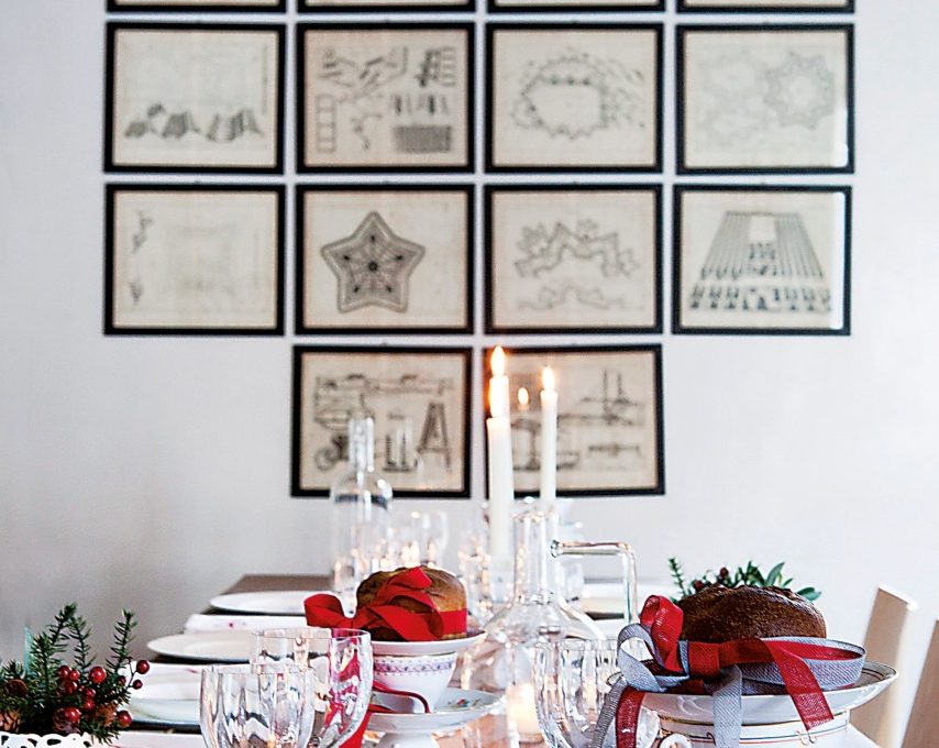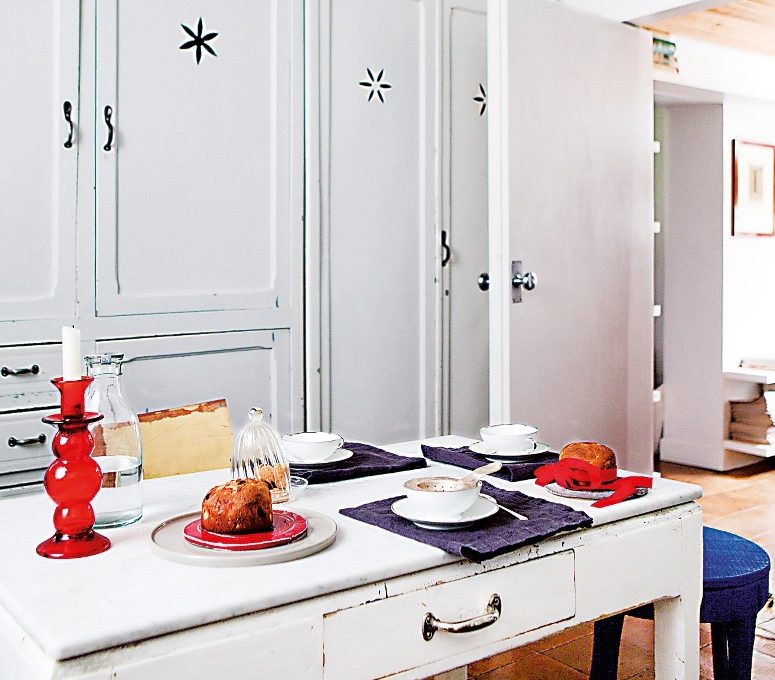 Per la colazione del 25, la tavola della cucina è imbandita con semplicità e cura, come si faceva una volta. Marmellate genuine e mostarde mantovane (come quelle dell’agriturismo Corte Donda) risaltano colorate sullo sfondo bianco della cucina e addobbano l’ambiente quasi come il Pinocchietto rosso di Alessi (cm 13,5h € 21). Per completare l’atmosfera domestica, barattoli vecchio stile di vetro e latta di c.u.c.i.n.a. (www.cucinastore.com) e tovaglioli di lino piegati in quattro usati come tovagliette (Linum Italia). Sul piatto-bottone rosso in ceramica (in vendita da Mia via di Ripetta, €15), i biscotti fatti a mano (Biscottificio Deseo, Prato - biscottideseo.com) sono più invitanti che mai. Le candeline sono di EDG Enzo De Gasperi, la vecchia bottiglia da latte usata come brocca è di c.u.c.i.n.a.