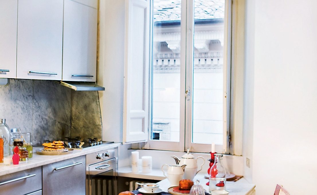In cucina, atmosfera casalinga che unisce materiali tradizionali e high-tech. L’angolo cottura è in acciaio satinato con top e alzata in marmo, le credenze classiche sono recuperate e laccate di bianco, e il vecchio tavolo è stato reinventato con rotelle industriali. Infine, per le sedute, due azzeccatissimi pezzi speciali: la sedia assemblata di Piet Hein Eek (www.pietheineek.nl) e lo sgabellino Raw di Muuto di un eccentrico blu Klein (€39, 53h, €199). La lampada a sospensione è Sosia di Castaldi (Ø cm 42 €602), disponibile anche nella versione Mini (Ø cm 30).