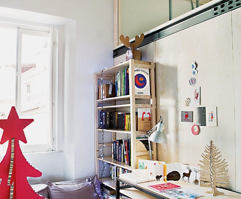 L’albero in cartone Xmas Tree Large (A4Adesign, 70x70x145h, €99) riempie la stanza, e la Renna Grande 3d di Essent’ial in cartone avana riciclato addobba la libreria Ivar di Ikea (90x30x179h, €49,42). Sullo scrittoio, una miniscenografia fatta con un alberello in legno (Trend House, da €13,50) e tanti biglietti d’auguri (Corraini Edizioni).