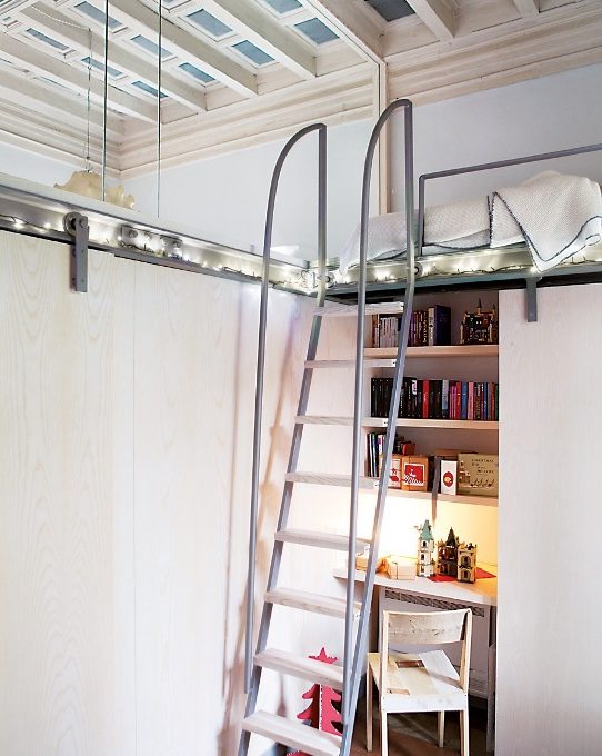 La zona notte è organizzata attraverso un sistema a soppalco autoportante in acciaio e pannelli scorrevoli in frassino sbiancato che sfruttano le putrelle come binari e... in questi giorni anche come diffusori per le lucine! Il soffitto a cassettoni è stato ridipinto con colori in stile ’700 romano: bianco travertino con gli sfondi in grigio cielo.