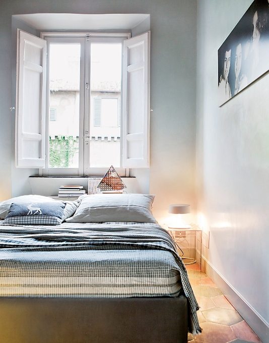 Dietro al letto, a mo’ di testiera, un piano d’appoggio in più per libri, oggetti, e... ovviamente un piccolo albero di Natale! L’abat-jour China Bianche di Penta (Ø cm 23x22,5h, €343) è appoggiata sul comodino trasparente Jolly di Kartell (cm 40x40x40h, €94): effetto lanterna!