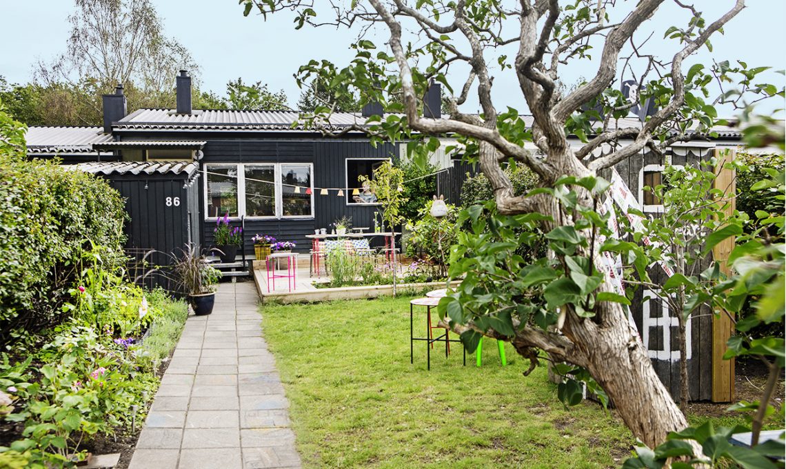 Aperto sul patio, l’ingresso porta la natura in casa con la tappezzeria super fiorita di Josef Frank [Varklockor su » http://www.svenskttenn.se €97 il rollo da m 10x53 cm]. Sedia gialla [simile a Stefan di Ikea €24,99].