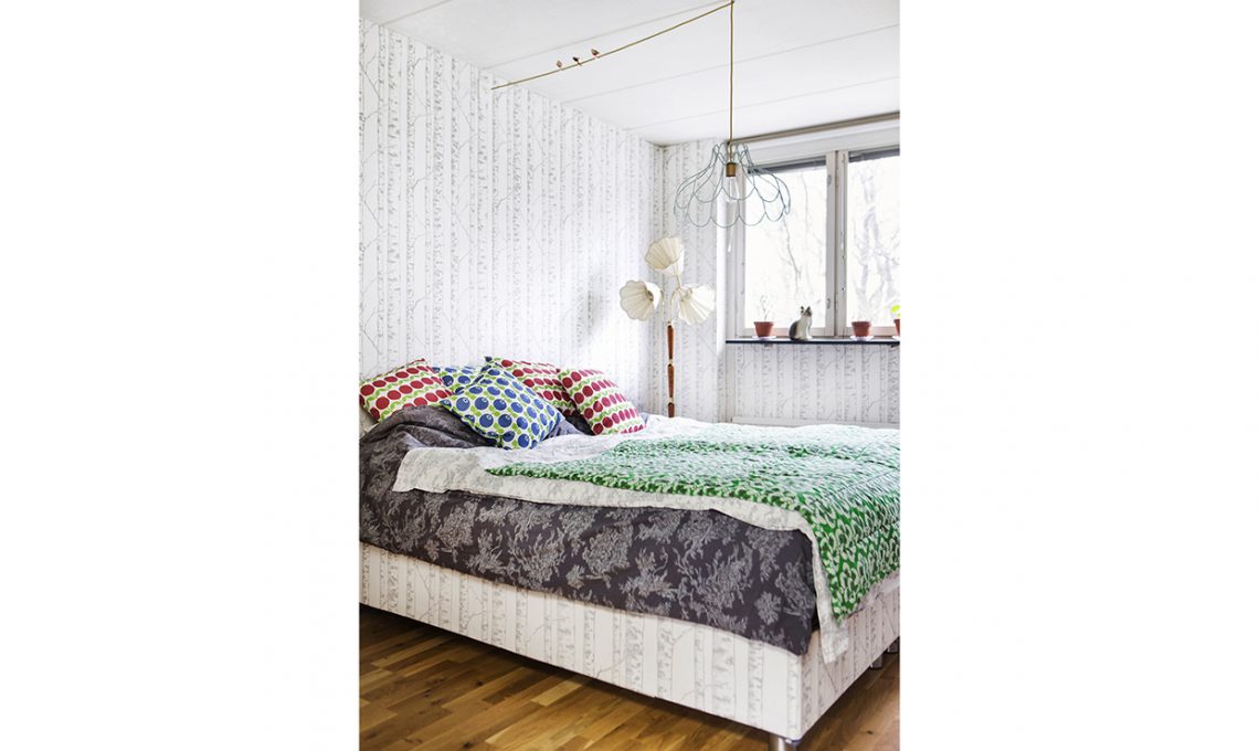 In camera My ha trovato la carta da parati con le betulle [simile a Woods di Cole & Son] che ha usato anche per ricoprire il cassone del letto. I paralumi a forma di fiore, gli uccellini sul filo e i cuscini con i mirtilli (un pattern disegnato da My) decorano con ironia.