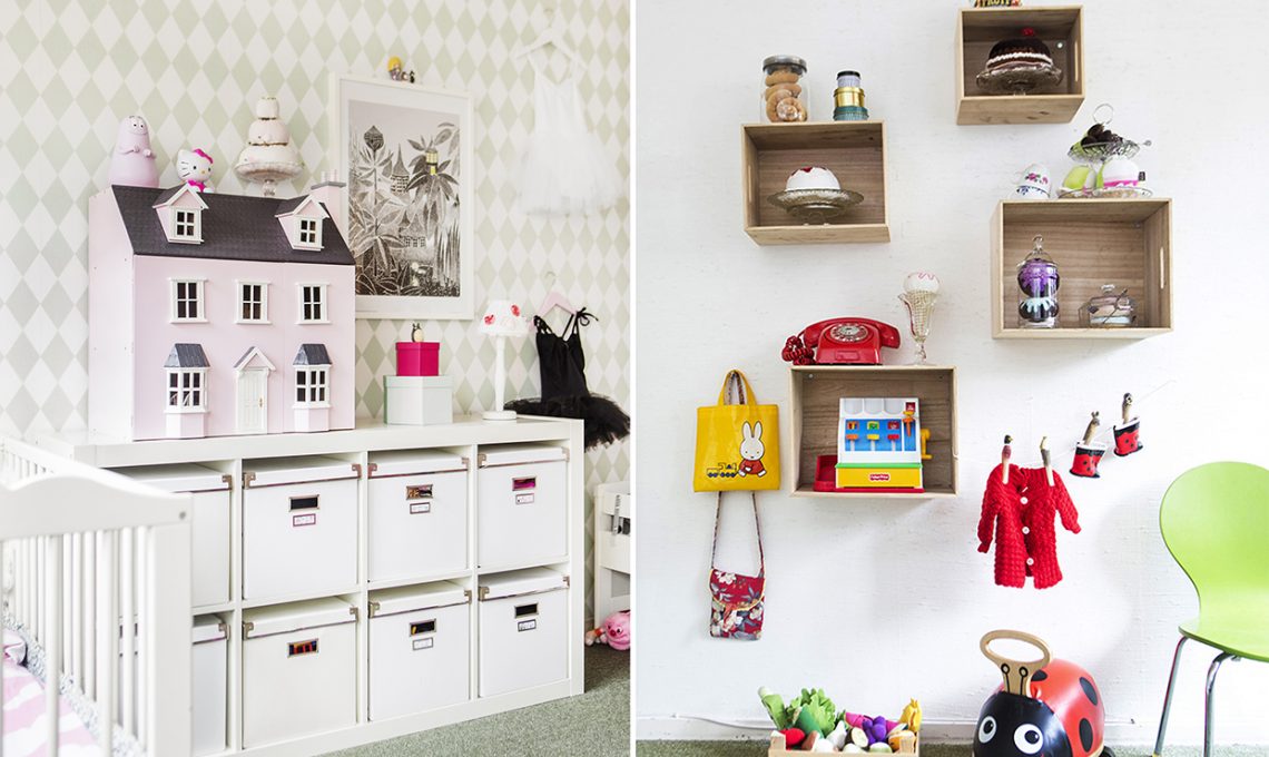 Invece delle mensole, le cassette di legno appese alla parete diventano contenitori. E per tenere in ordine, le scatole di cartone Ikea nella libreria Expedit.