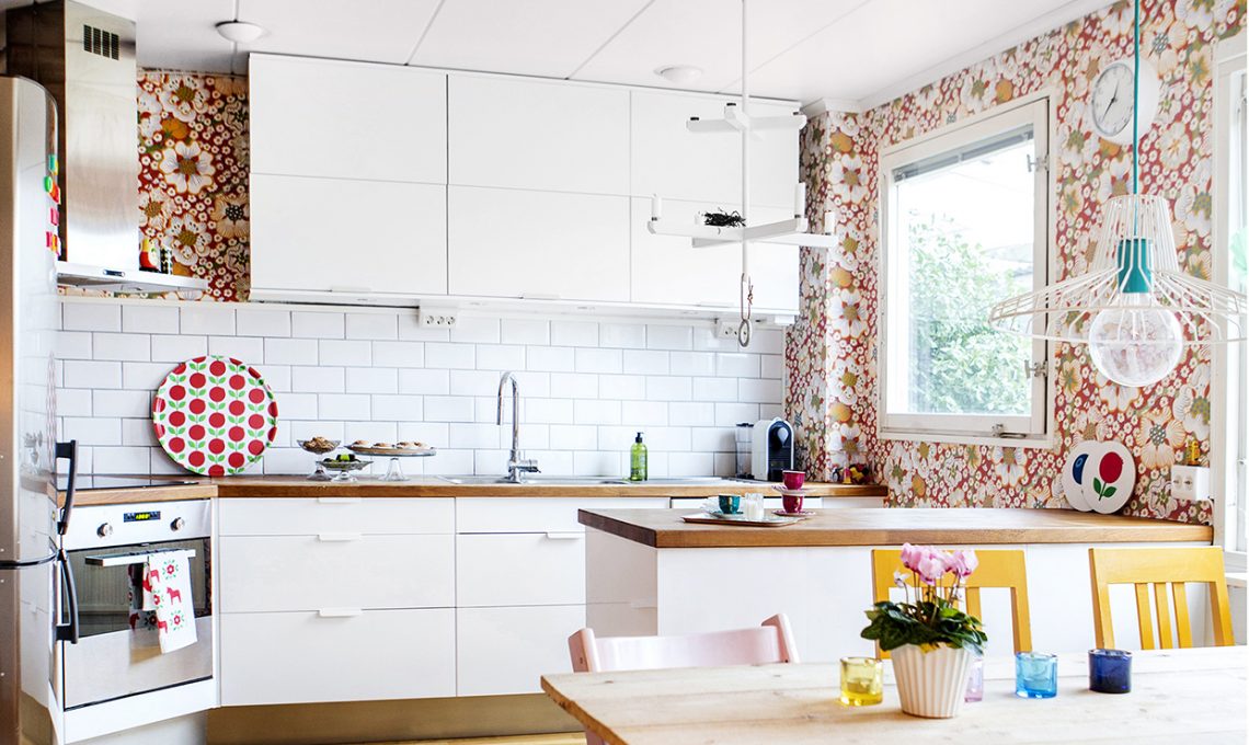 My Floryd Welin è una graphic designer, disegna e crea pattern che finiscono su cuscini, tovaglioli, vassoi, piatti, tazzine. La sua casa è come lei, un trionfo di fantasie ispirate alla natura, mixate su tante carte da parati tipiche della tradizione svedese.