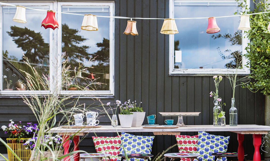 Intorno gli sgabelli, i cuscini con stampe a maxi mirtilli disegnati da My e il verde. L’idea décor? La ghirlanda di lucine fai-da-te con i copri abat-jour vintage.