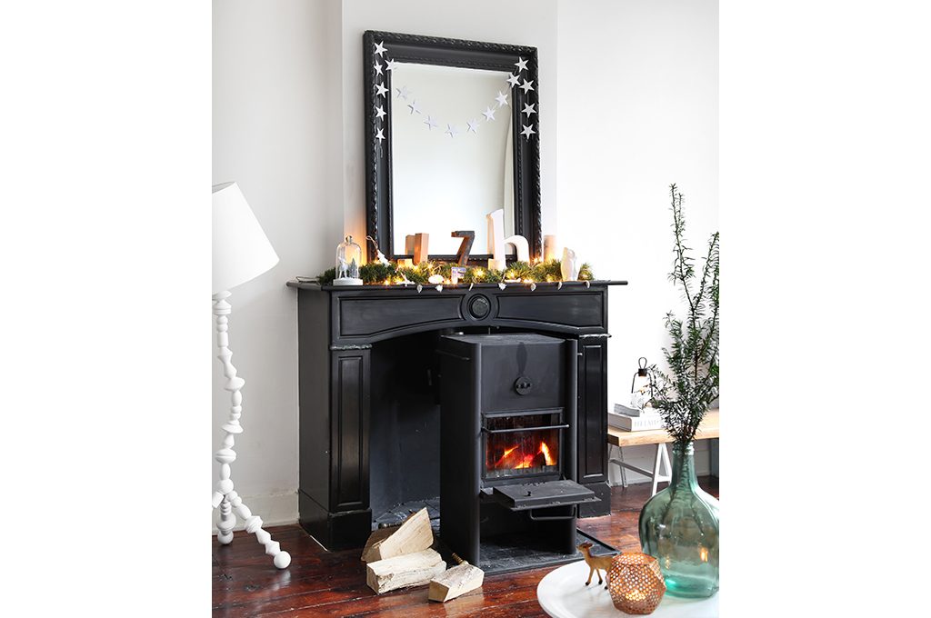 Elementi d’epoca danno vita a una vera casa di famiglia. Lo specchio era della nonna della proprietaria, che l’ha dipinto di nero per accostarlo al marmo del camino. Lampada Svarva [Ikea Ps]; lettere simili puoi trovarle da [Cargo].