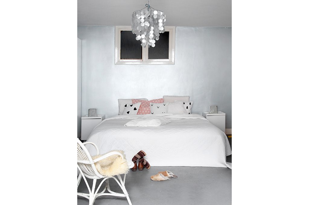 La camera da letto dei padroni di casa è essenziale: letto sommier, due comodini semplici, una poltroncina in midollino bianco. Il décor è affidato ai tessili, bianchi o appena colorati, con trame lisce o ‘lanose’.