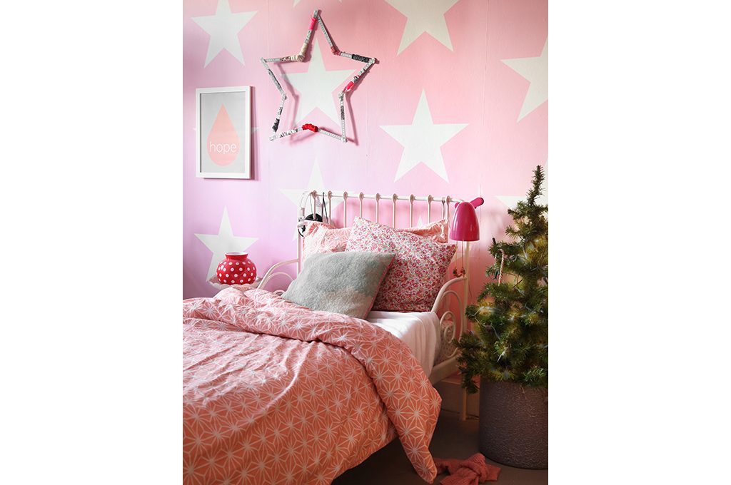 Un ‘twist’ di rosso a pois e una scala cromatica di rosa per la camera delle bambine. Stelle come elemento décor: applique Alabama [Maisons du Monde €119,90]; letto Minnen [Ikea €108,49]. L'idea fai da te: un metro da falegname piegato e rivestito di stoffa diventa una stella!