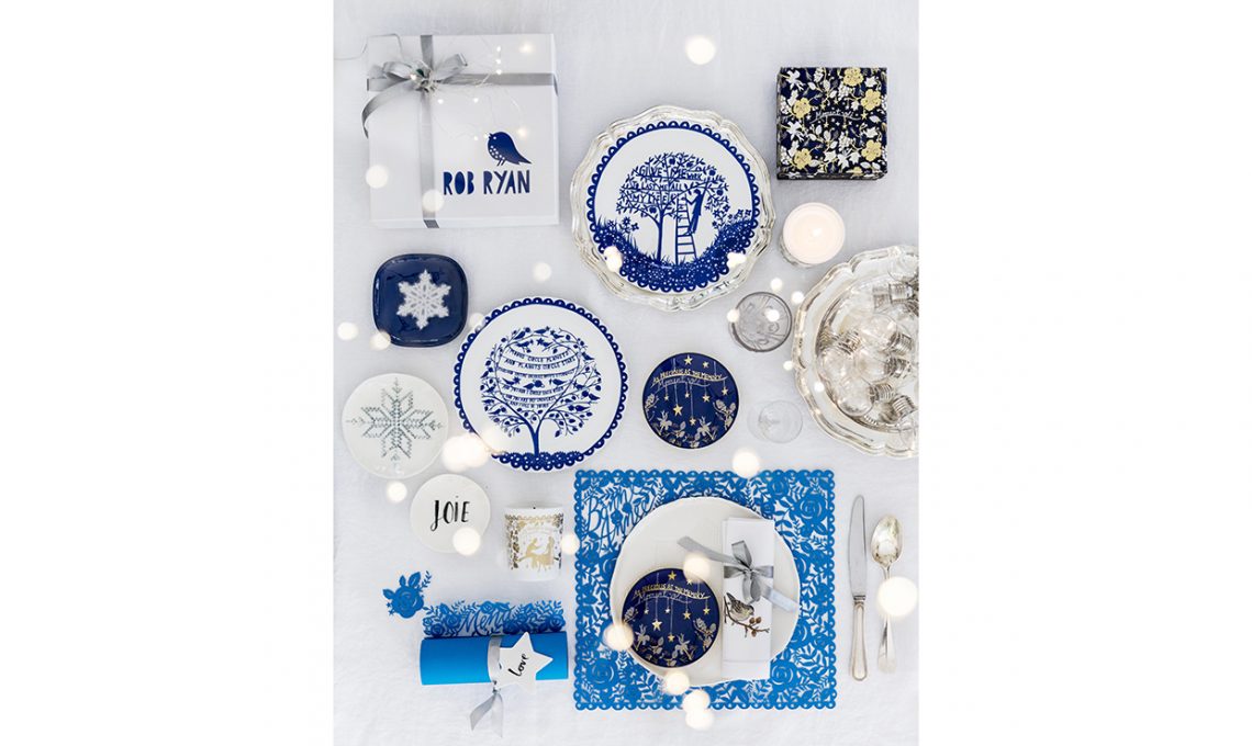 Questa tavola si ispira all’arte del papercutting di Rob Ryan, l’artista che ha firmato per Fragonard i packaging della collezione Natale 2016. Sottopiatto e menù sono intagliati con la tecnica a tema [creazione di Silvia Raga, blogger di ’Giochi di carta’]. Piatti di Rob Ryan con scatola [Fleux], tovagliolo ricamato con uccellino [Fragonard], piattini Fiocco di neve e Joie [GioveLab].