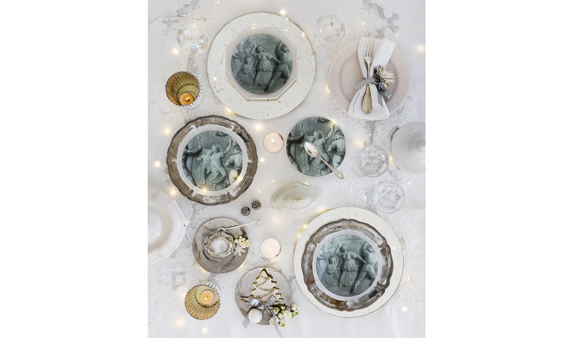 Piatti con dense pennellate color argento [Ceramiche Fasano da Funky Table]; le ceramiche grigio-verdi sono Trompe l’oeïl [Fragonard €20]. Bicchierini tealight [Enzo De Gasperi] e il lega-tovagliolo in alto a destra: è un fiore vero, immerso in un bagno di argento, in vendita da Funky Table come il set sale e pepe. La tovaglia è una fiandra di famiglia: «Natale è il momento ideale per tirar fuori dagli armadi il corredo antico della nonna» dice Cristina.