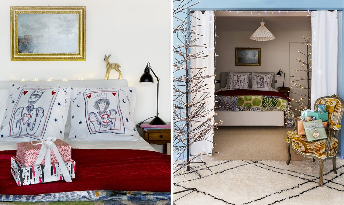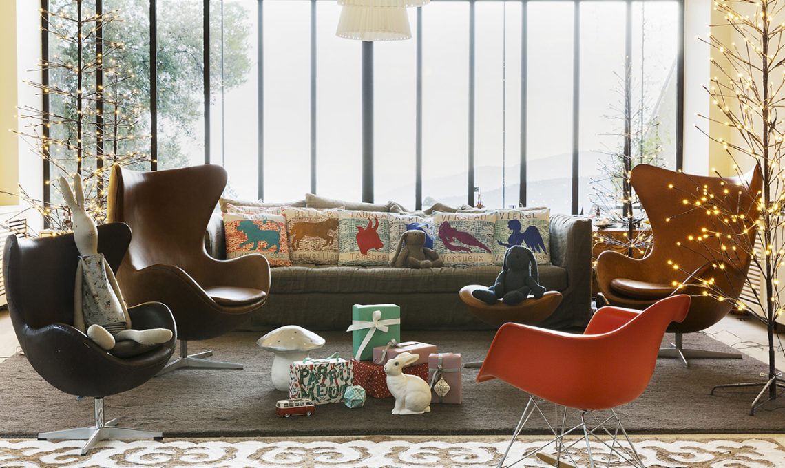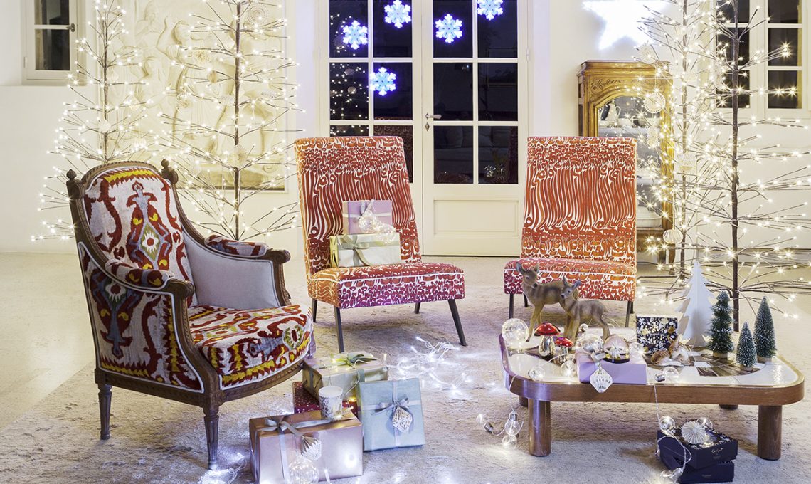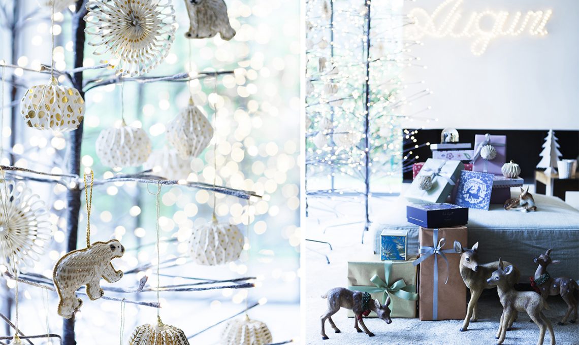 Tutto è pronto per la festa: tra pacchetti e bigliettini paper cutting [coll. Moment volé di Fragonard] fa capolino una famigliola di cerbiatti [Enzo De Gasperi]. Sugli alberi, decori [Fragonard]; sul pouf, cerbiatto di ceramica [&Klevering]. Scritta Auguri [Arteleta].